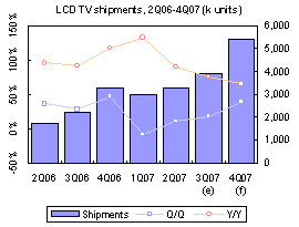 Despite retail prices for most LCD TV segments falling in the third quarter, prices in the 32-inch segment rose, somewhat constraining demand, so overall shipments of 3.9 million LCD TVs from Taiwan were up only 18% sequentially and 75% on year.Table of contents