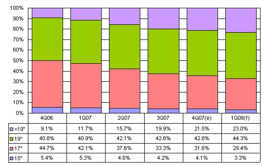 Chart 7: LCD monitor shipments by screen size, 4Q06-1Q08