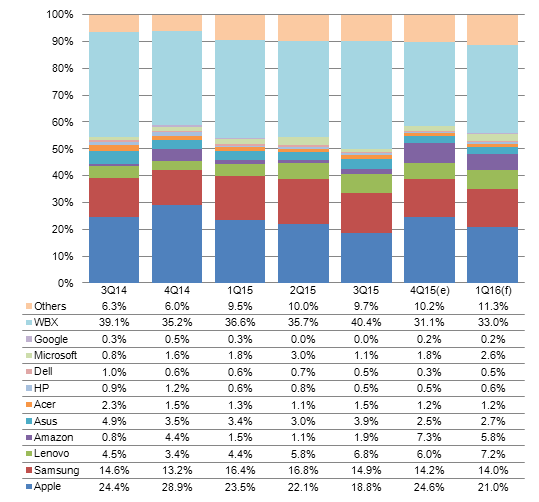 In the fourth quarter, shipment volumes of Apple’s iPad Air 2 were twice as high compared to the previous quarter. In addition, the large-screen-size iPad Pro was introduced. These factors drove Apple’s share of overall tablet shipments up to nearly 25% of overall shipments, making the fourth quarter the quarter of the year in which Apple accounted for the highest share of overall shipments.