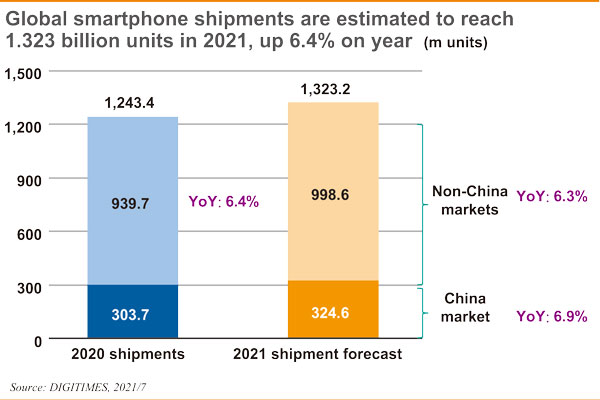 Global smartphone shipments once reached over 1.4 billion units annually but were trimmed to 1.243 billion units in 2020, thanks to COVID-19. But they are predicted to make a rebound to 1.323 billion units in 2021. DIGITIMES splits China from other markets when conducting surveys and estimates of the global handset market. China's rapid economic rise in recent years enabled a pre-pandemic global handset market share of over 30% for the country. China's handset industry, hitchhiking on surging domestic market demand and leveraging their partnerships with Taiwan-based suppliers, has earned a pivotal role in global sales and production. As such, it is justifiable to separate the Chinese market from the rest of the world when trying to understand the Taiwanese business community's moves to capitalize on the business opportunities from the Chinese market and the global rollout by Chinese brands.