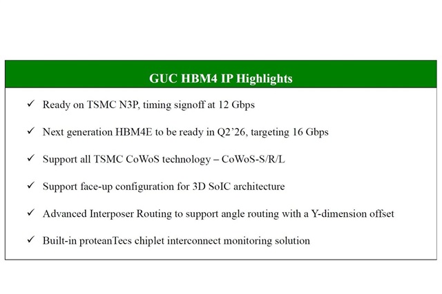 GUC's previous-generation HBM3E PHY and Controller, deployed in customers'3nm products, have achieved speeds 15% above specification in production. JEDEC continues to drive an aggressive HBM roadmap, increasing memory throughput and capacity while further doubling the data bus width in HBM4. Comparing with HBM3E, GUC's HBM4 IP delivers 2.5x bandwidth, while improving power efficiency by 1.5x and area efficiency by 2x.