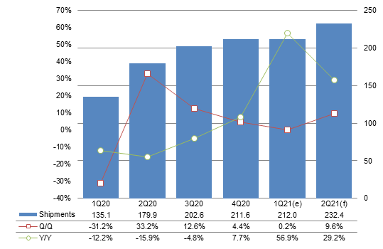 Second-quarter 2021 smartphone AP shipments to China-based vendors are estimated to come to 232.4 million units, up 9.6% quarter-over-quarter and 29.2% year-over-year mainly as smartphone brands continue to ramp up orders and smartphone AP and PMIC capacity continues to expand.