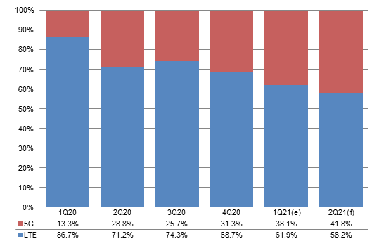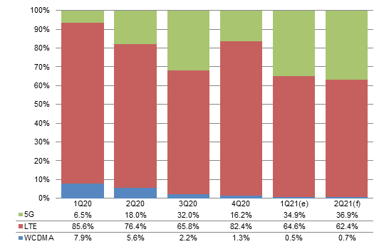 Chart 16: Qualcomm shipment share by baseband type, 1Q20-2Q21