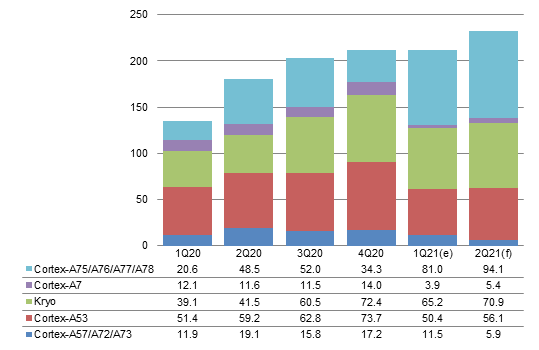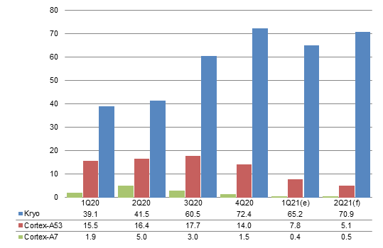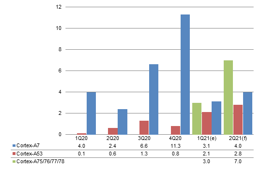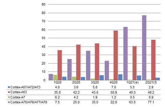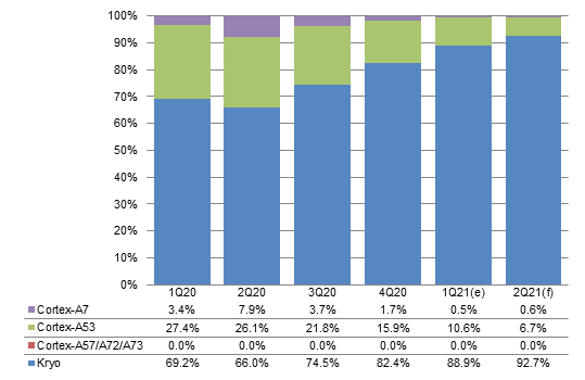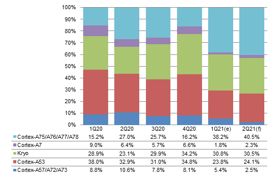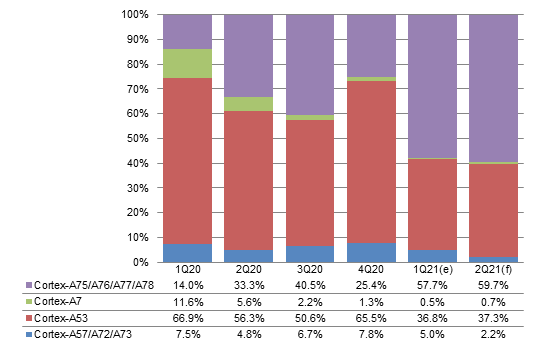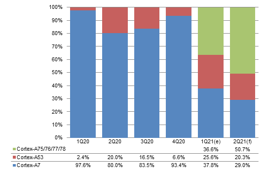 With few new projects in emerging markets on top of tight smartphone PMIC capacity forcing Qualcomm to give priority to high-end phones, the share of Cortex-A7 is estimated to come short of 1% in first-half 2021.