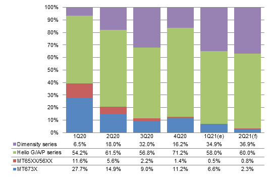 With MediaTek's new 5G AP Dimensity 850 going into volume production and MediaTek's access to more adequate 5G AP production capacity compared to Qualcomm, MediaTek will continue to enjoy transferred orders. The share of Dimensity series among MediaTek's AP shipments is therefore expected to grow to 36.9% in second-quarter 2021.