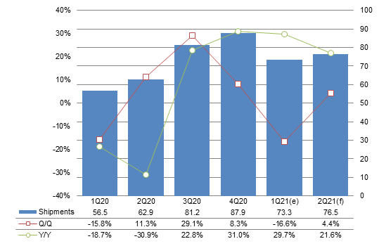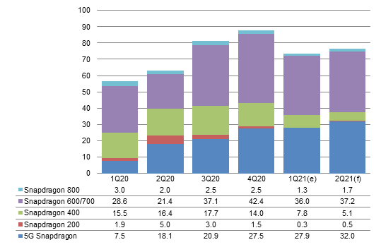 Qualcomm's second-quarter 2021 smartphone AP shipments to China-based vendors are estimated to come to 76.5 million units, up 4.4% quarter-over-quarter and 21.6% year-over-year.