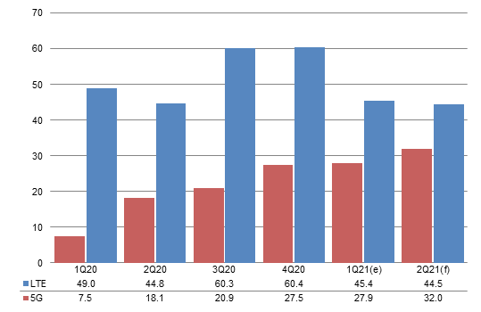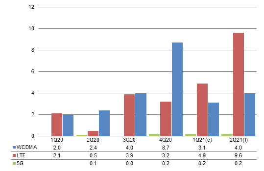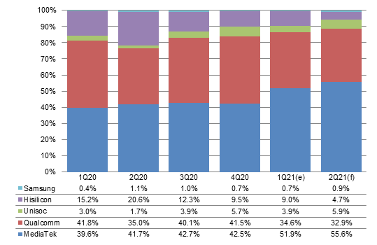 Going into second-quarter 2021, Qualcomm will continue to sustain impact from the tight supply of Samsung's 5nm and 8nm process capacity. Its shipments will be affected to a larger extent than MediaTek's. Moreover, MediaTek's 4G processors feature a more compelling cost-performance (CP) ratio and MediaTek allots more resources for its 4G chips. As such, MediaTek is expected to still lead Qualcomm by a wide margin in terms of market share. Hisilicon can only ship existing stock so its market share will get surpassed by Unisoc.