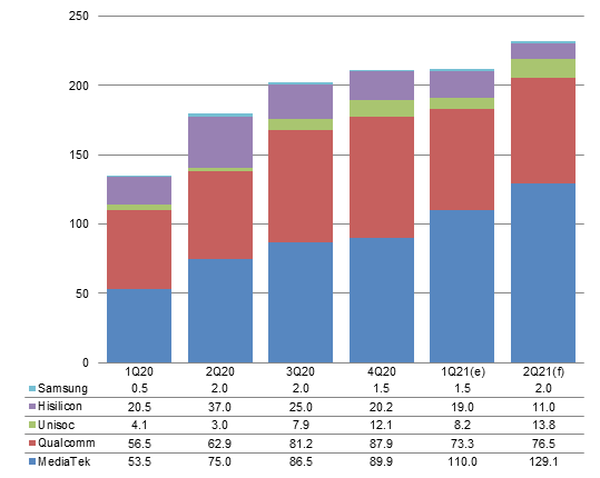 MediaTek's 4G chips feature more compelling CP ratios than Qualcomm's and their supply could not keep up with vendors' demand to stock up in first-quarter 2021. As such, MediaTek's 4G AP shipments are expected to be deferred to second-quarter 2021.