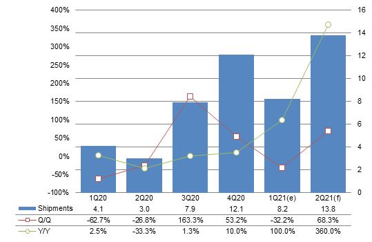 Chart 2: Shipments by supplier, 1Q20-2Q21 (m units)