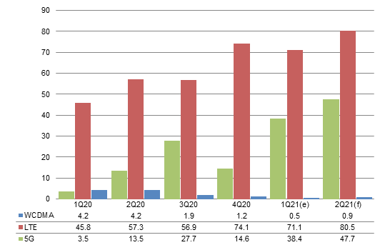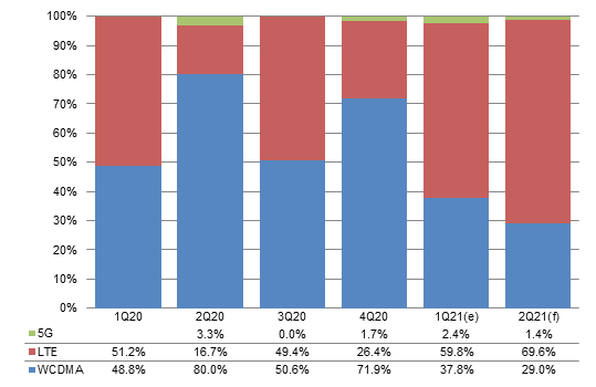 Chart 9: MediaTek shipments by baseband type, 1Q20-2Q21 (m units)
