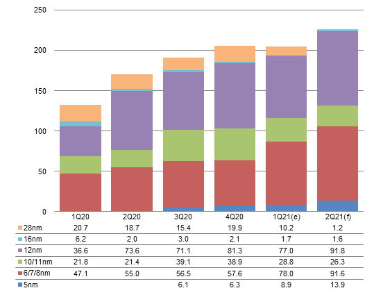 Going forward into second-quarter 2021, Transsion and Honor will significantly hike their use of Unisoc's 4G AP made on the 12nm node. On top of that, shipments to fill 4G AP orders placed in first-quarter 2021 are being deferred. As such, the share of 12nm smartphone AP is estimated to climb to 39.5%, on par with the share of 6/7/8nm smartphone AP.