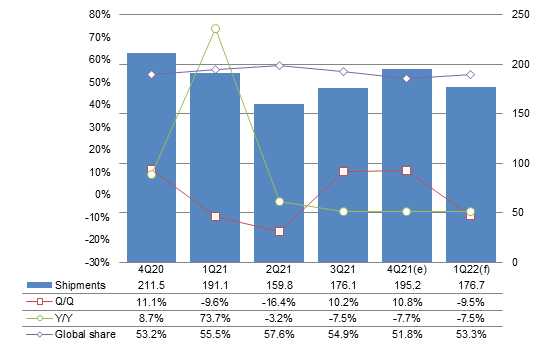 China-based vendors are expected to ship a total of 176 million phones in first-quarter 2022, down nearly 10% quarter-over-quarter and 7.5% year-over-year mainly as markets at home and abroad enter a traditional low season and the domestic demand shows no sign of improvement.