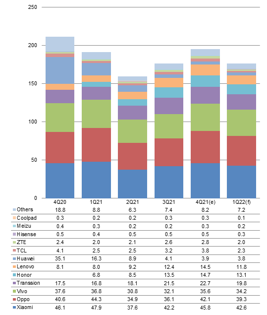 Looking into first-quarter 2022, with overseas markets entering the traditional low season and the outlook for festive sales during the Lunar New Year holidays being clouded by the weak economy, China-based smartphone brands are expected to focus efforts on depleting their inventory and their shipments are estimated to decline 10% from the prior quarter.