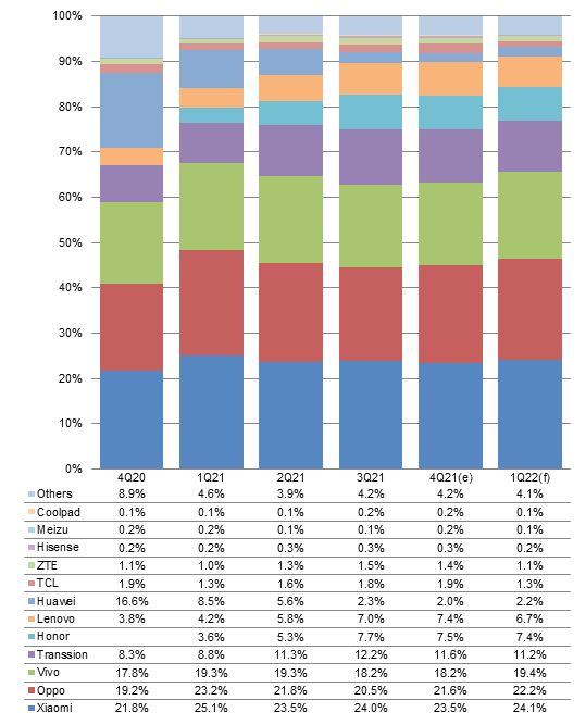 Going forward into first-quarter 2022, the top three China-based brands Xiaomi, Oppo and Vivo will account for 65.7% of the phones shipped by all China-based vendors, surging 2.4 percentage points sequentially. Honor will maintain a similar share while Lenovo may see its momentum weaken amid the traditional low season in overseas markets.