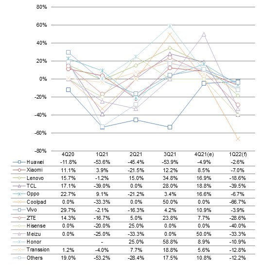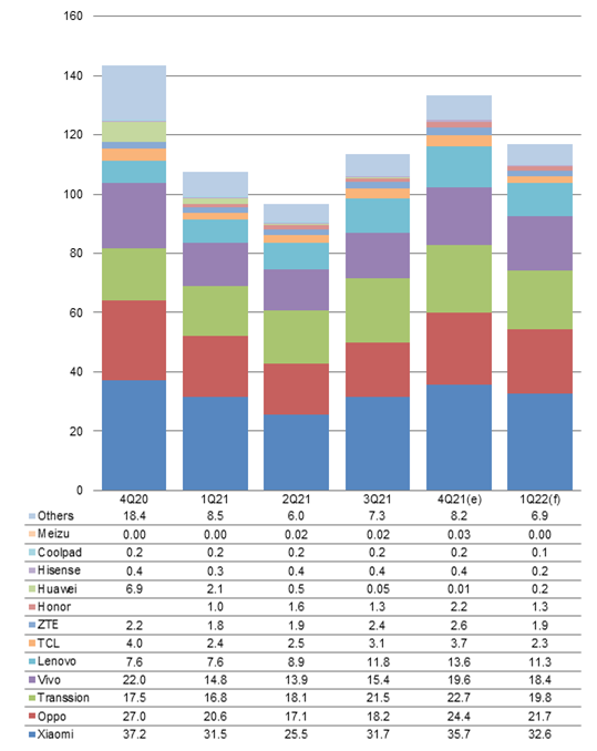 Looking into first-quarter 2022, with new phones contributing little to market demand recovery, tier-1 brands are expected to make conservative shipments and all China-based vendors are set to experience sequential declines across the board.