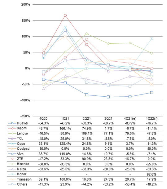 Looking into first-quarter 2022, with Huawei's market share getting all divided and the distribution of market shares among China-based vendors stabilizing, weak phone upgrade demand and low season factors will result in a 10% on-year decline in the smartphone shipments by the top three China-based brands.