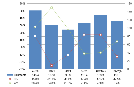 For first-quarter 2022 outlook, overseas shipments by China-based vendors are estimated to fall 12.2% sequentially amid the low season in overseas markets. However, on an annual basis, overseas shipments by China-based vendors are expected to increase 8.4% as China-based brands will no longer actively grab market shares in China as they did in early 2021 and therefore allocate more shipments to markets abroad to meet the 4G phone demand.