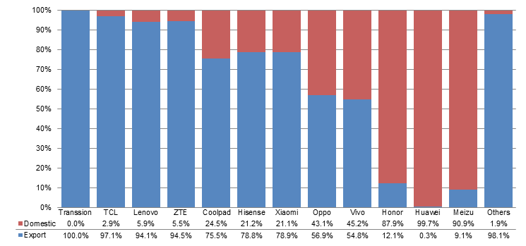 Xiaomi's ratio of overseas shipments climbed from 75.2% in the prior quarter to 78.9%, Oppo's climbed from 50.5% to 56.9% and Vivo's climbed from 47.9% to 54.8%, indicating that China's domestic demand was not improving.