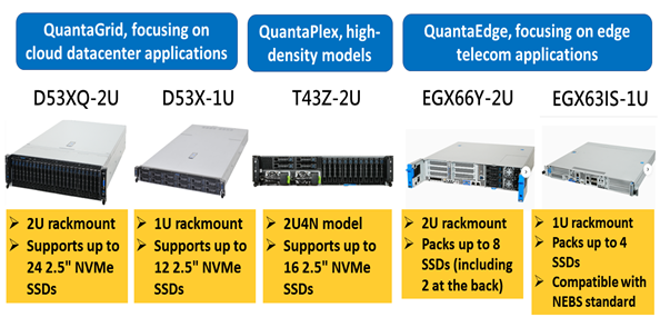 For 5G edge telecom applications, QCT introduced the QuantaEdge series, featuring a short depth (<500mm). The EGX66Y-2U model is designed for RAN edge central units (CU), distributed units (DU) and mobile edge computing (MEC) applications while the EGX63IS-1U model is designed with Telco NEBS Level 3 compliance.