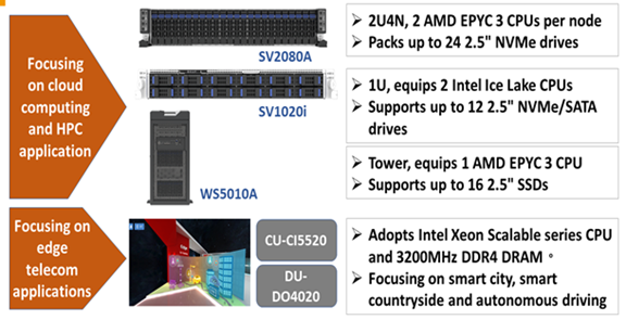 Its cloud HPC servers are mainly based on AMD third-generation EPYC CPU (codenamed Milan), including the 2U4N dual-socket server SV2080A, 2U dual-socket rackmount server SV2020A and single-socket tower server WS5010A.