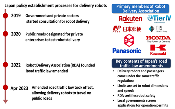 The development of delivery robots in Japan has been slower than in Europe and the US. In 2019, the Japanese government began studying the feasibility of delivery robots. In 2020, the Japanese government designated some public roads in specific areas for small-scale testing. And in 2022, it amended its road traffic law, allowing delivery robots to use public roads starting April 2023.