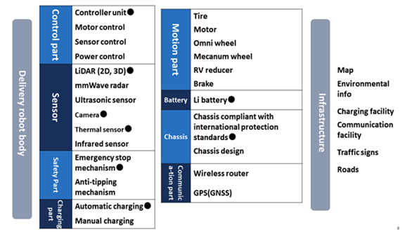 Delivery robots traveling on sidewalks, bike paths or roads need to identify and avoid pedestrians, vehicles and other moving objects, and must maintain environmental awareness amid weather changes. Therefore, delivery robots are mainly autonomous mobile robots (AMR) with the ability to plan their routes. They are equipped with a number of sensors such as LiDARs, radars, and cameras. Depending on the routes of travel, there are delivery robots that are autonomous vehicles driving on the road, and sidewalk robots that take the sidewalks and bike paths.