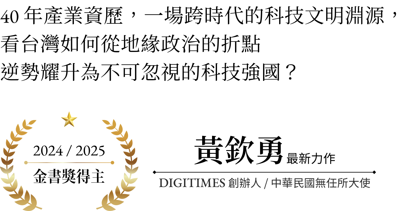 DIGITIMES 創辦人、金書獎得主親臨現場,帶您從一世紀的視角,揭開台灣在時代巨浪下,如何探索出與眾不同的路徑;在變幻無窮的產業環境下,台灣又是怎麼走出本土,創造獨屬台灣的電子產業國際舞台?